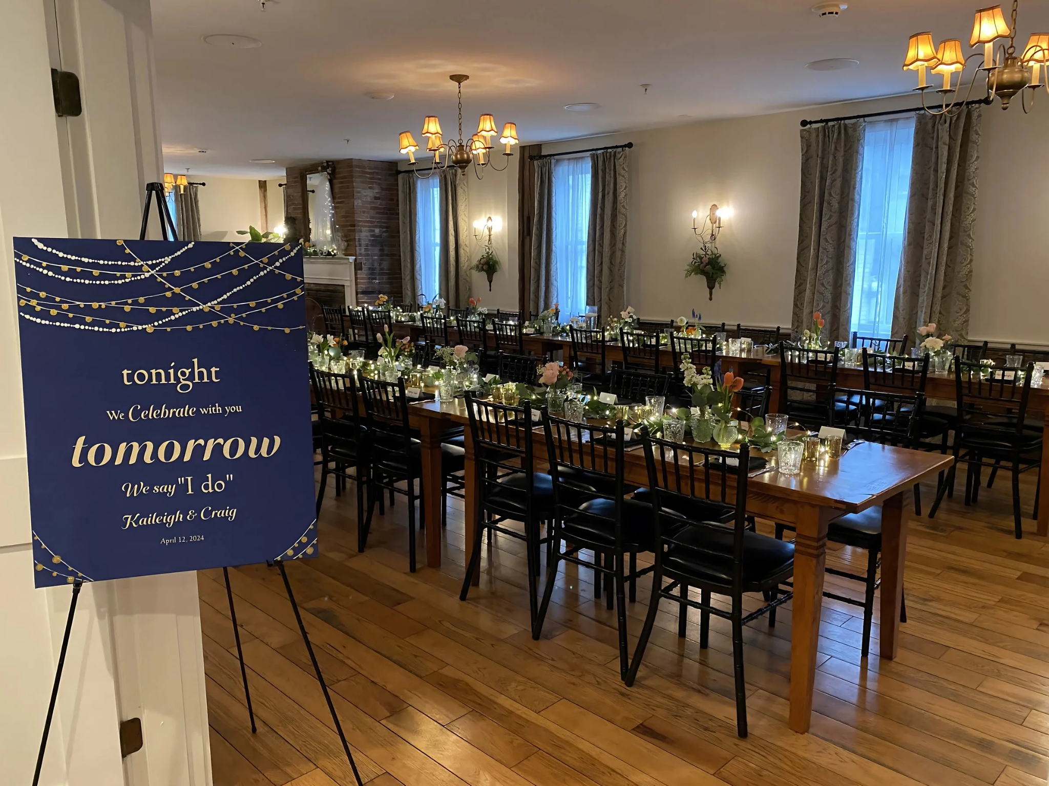 SARAH FROST HALL - 50 guests seated; 60 standing. Pictured above: Banquet style rehearsal dinner.